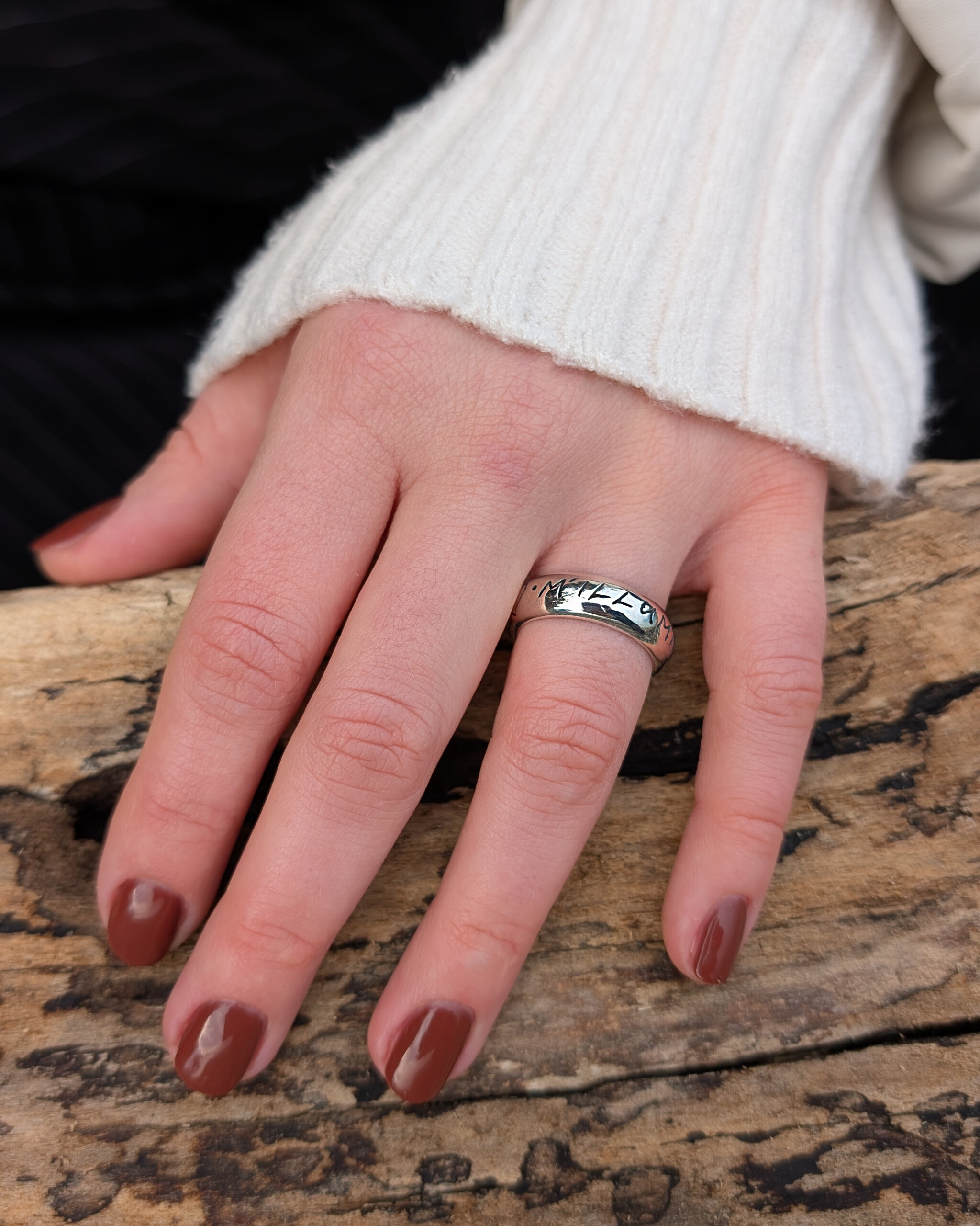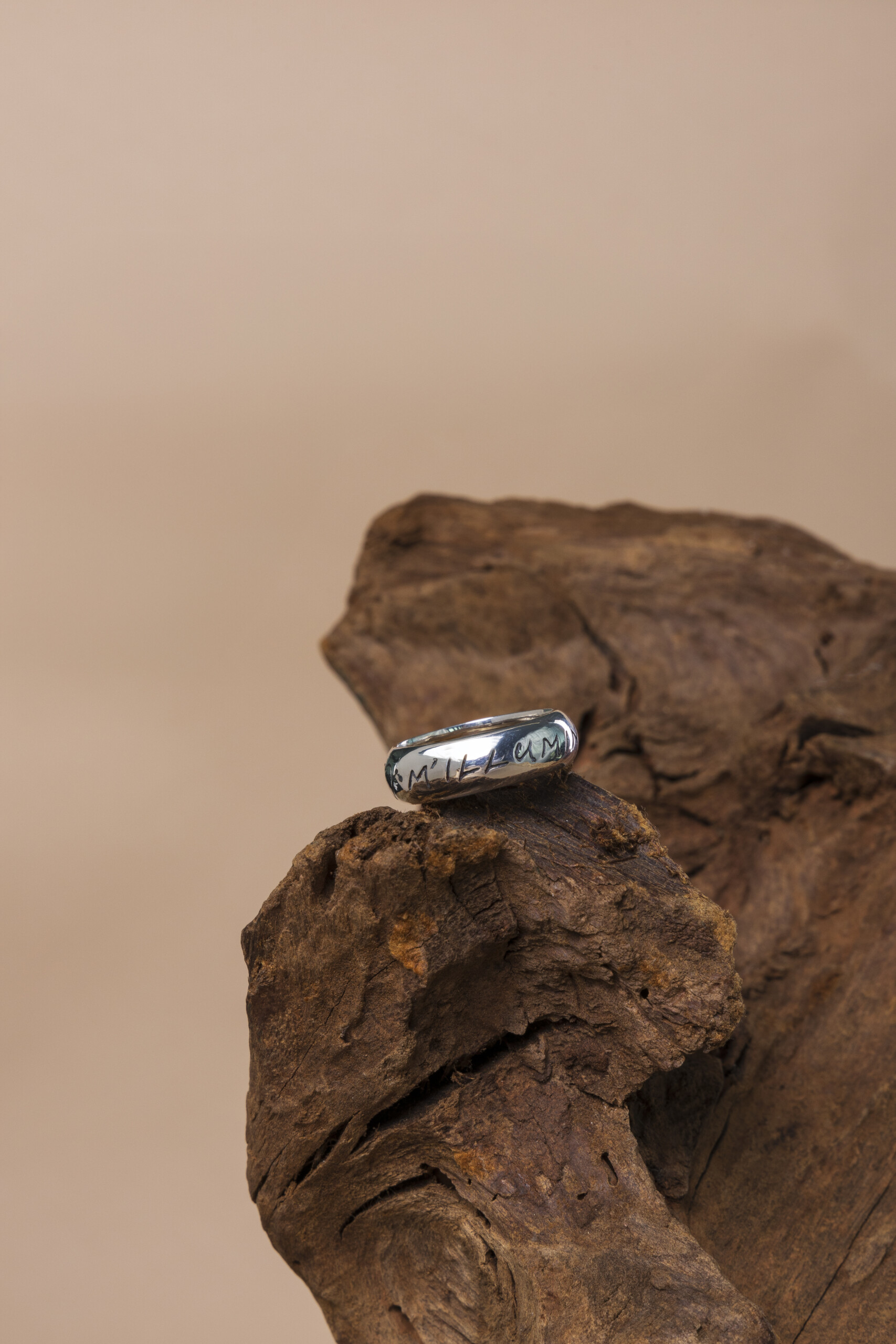 Questo anello in argento 925 è caratterizzato da un’incisione realizzata interamente a mano. È un gioiello pensato per essere personalizzato con un simbolo, una piccola frase o una citazione scelta da te e incisa direttamente sul metallo.