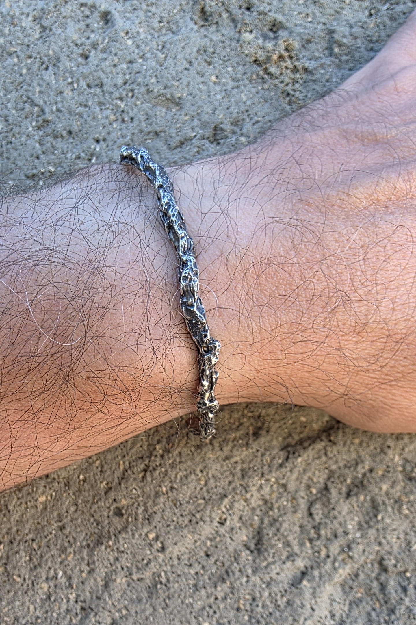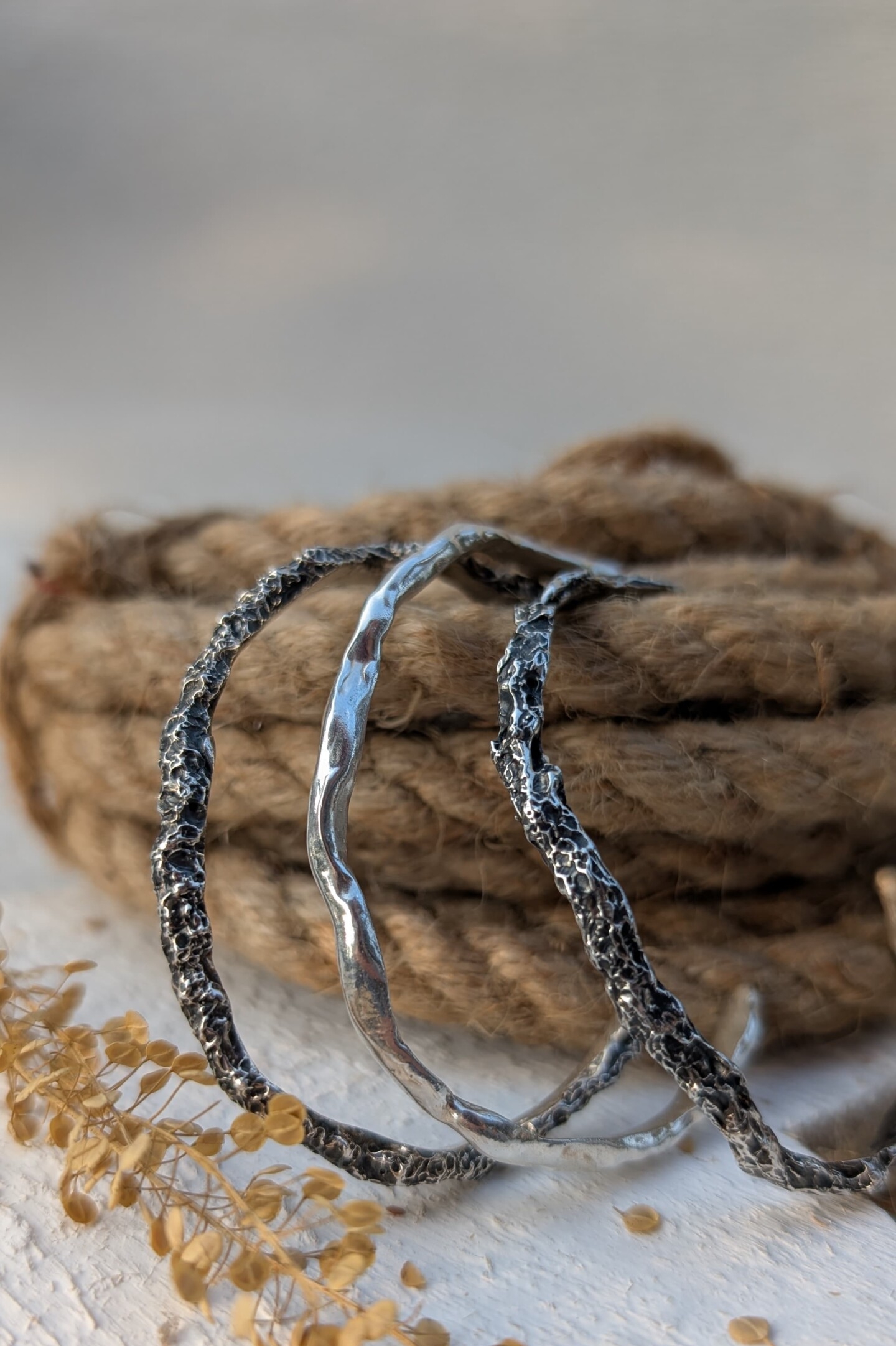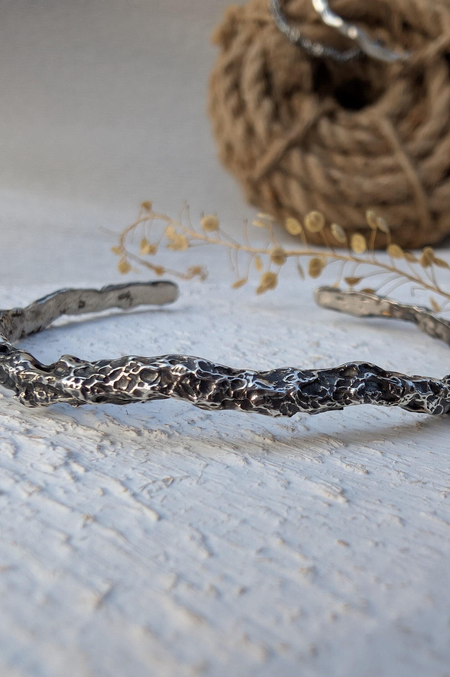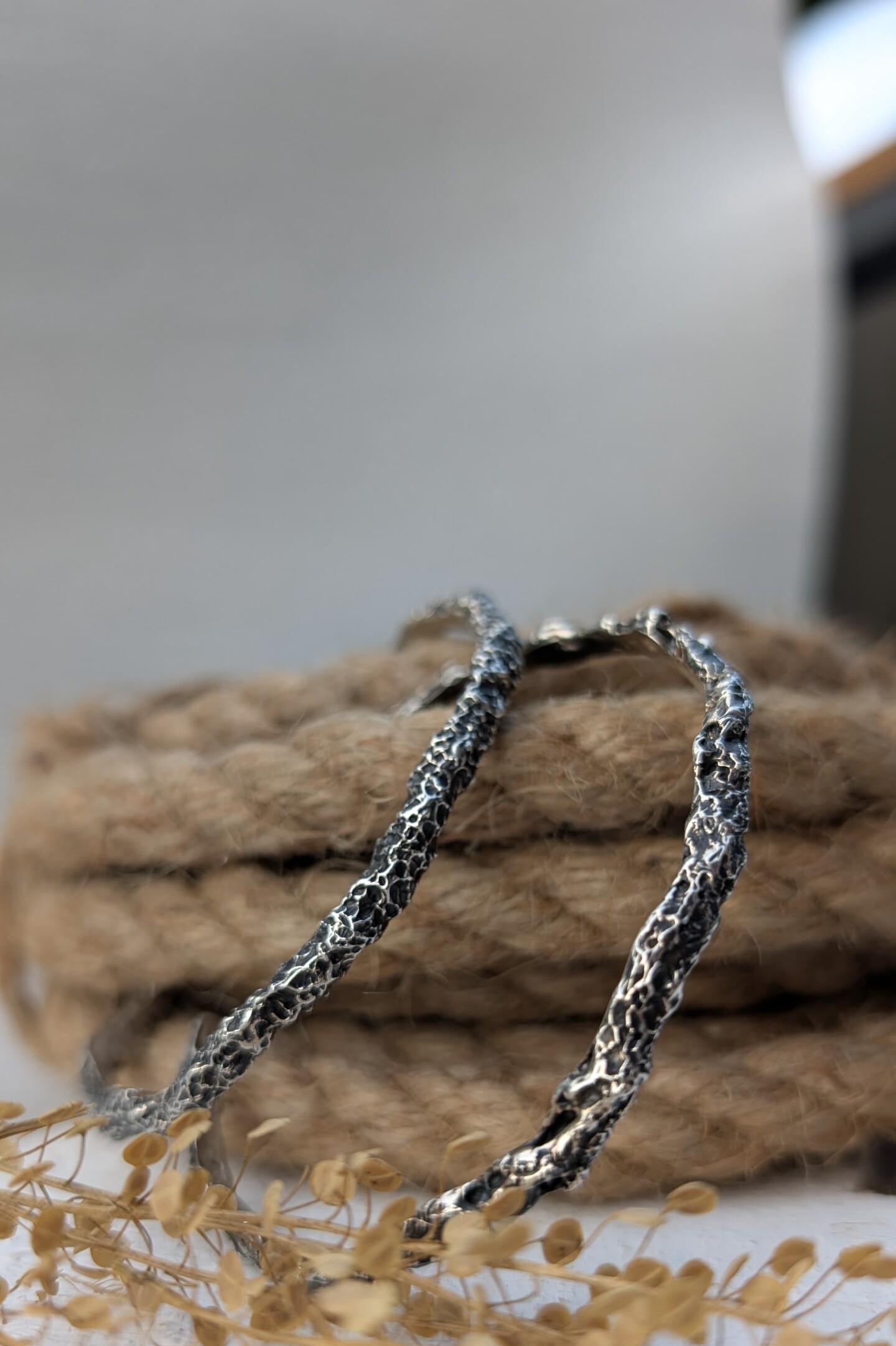 La superficie del bracciale rigido Basalto è pensata per chi ama un design materico ma armonioso, dove la brunitura manuale dell’argento esalta la profondità delle anse e la lucentezza dei rilievi. Un gioiello unisex fatto a mano che interpreta l’estetica vulcanica con un’eleganza fluida e un carattere deciso.
