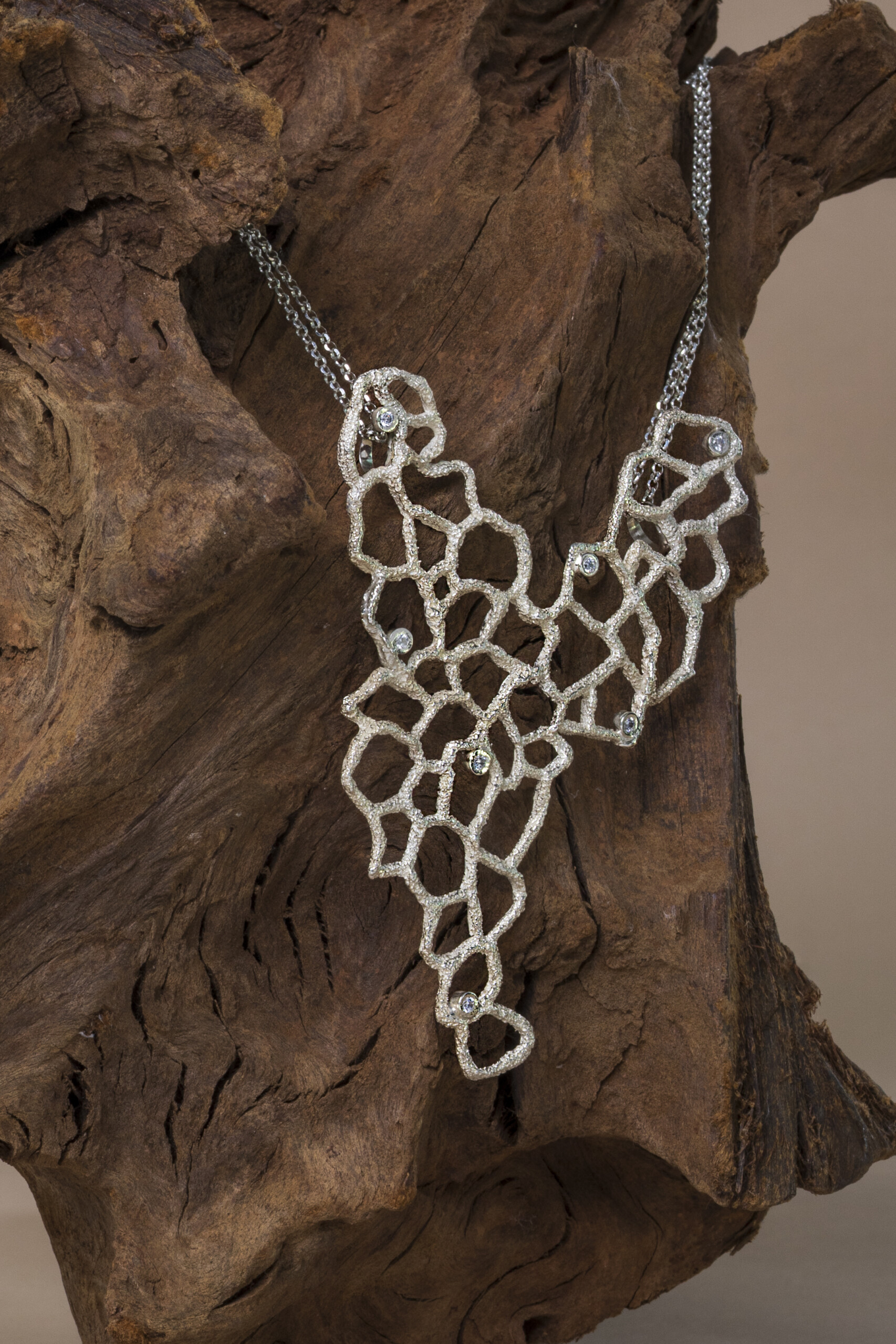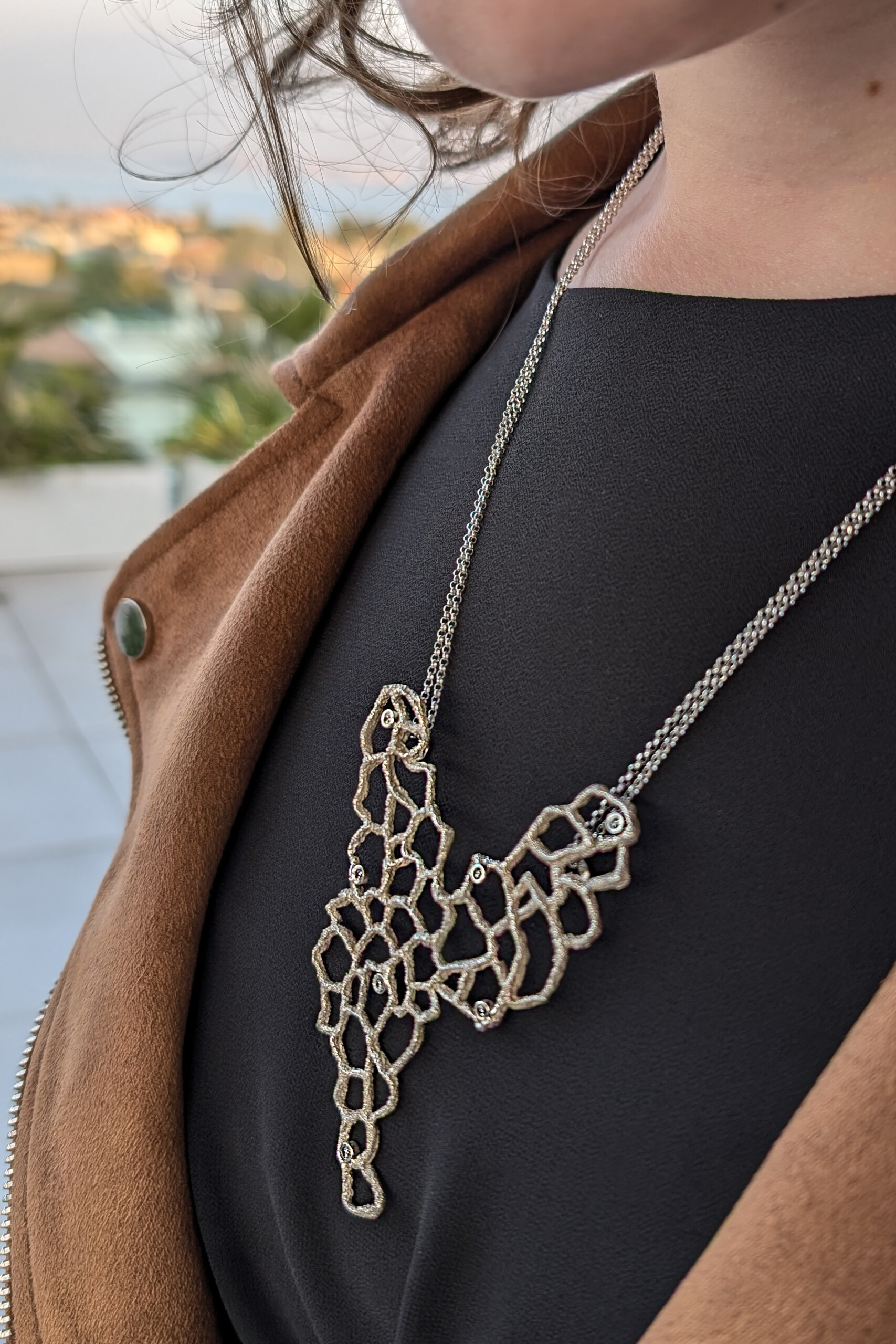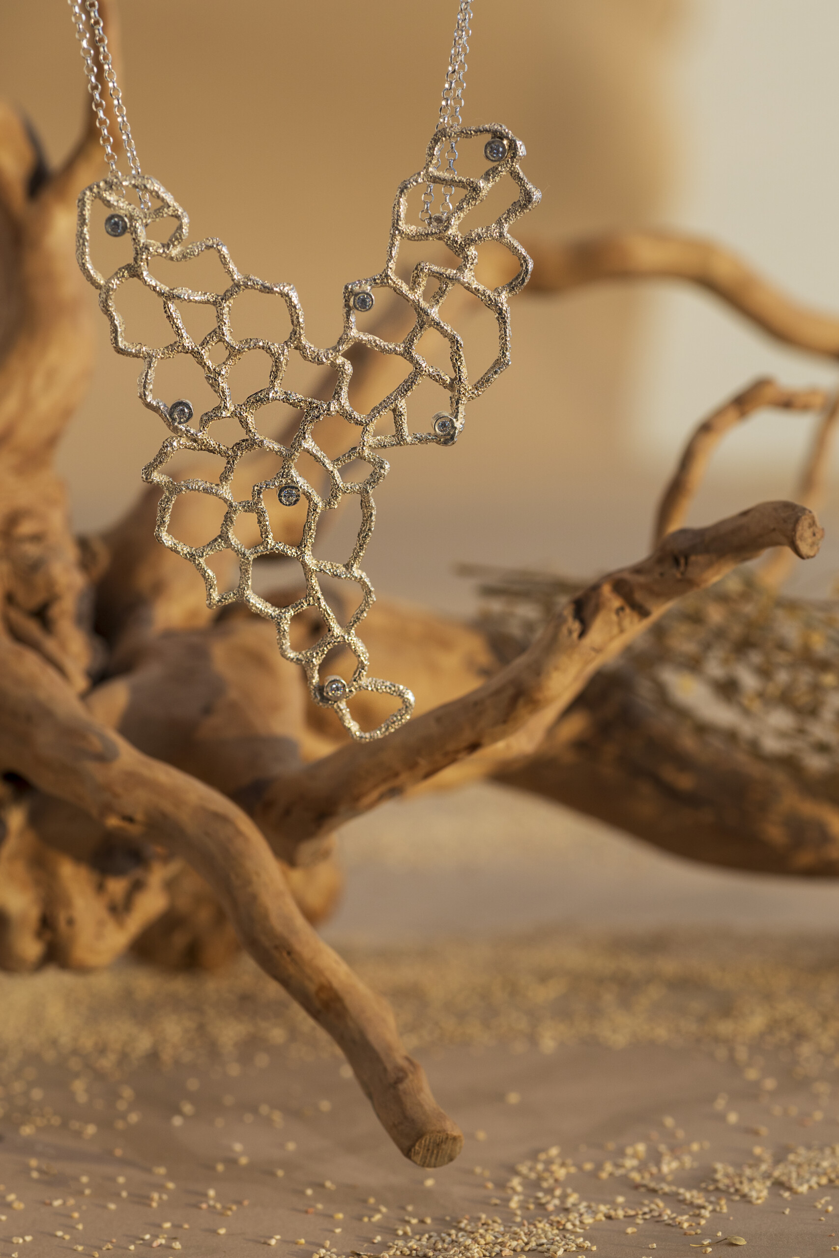 Il pendente centrale è il medesimo della versione in pelle: un pezzo dalle dimensioni importanti, caratterizzato da piccoli solchi e punte luminose che creano un ricercato effetto lucido e satinato. Interamente fatto a mano, il gioiello è impreziosito da 7 zirconi che ne esaltano la luminosità naturale.