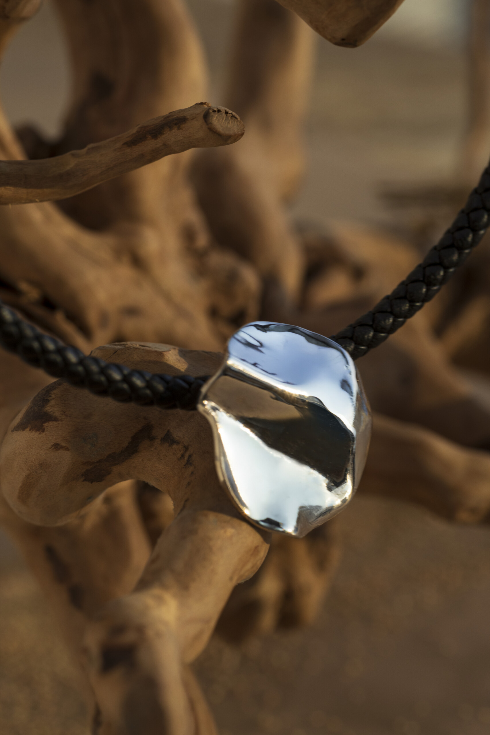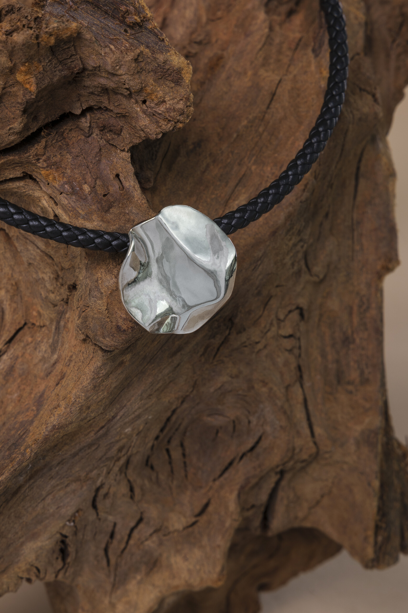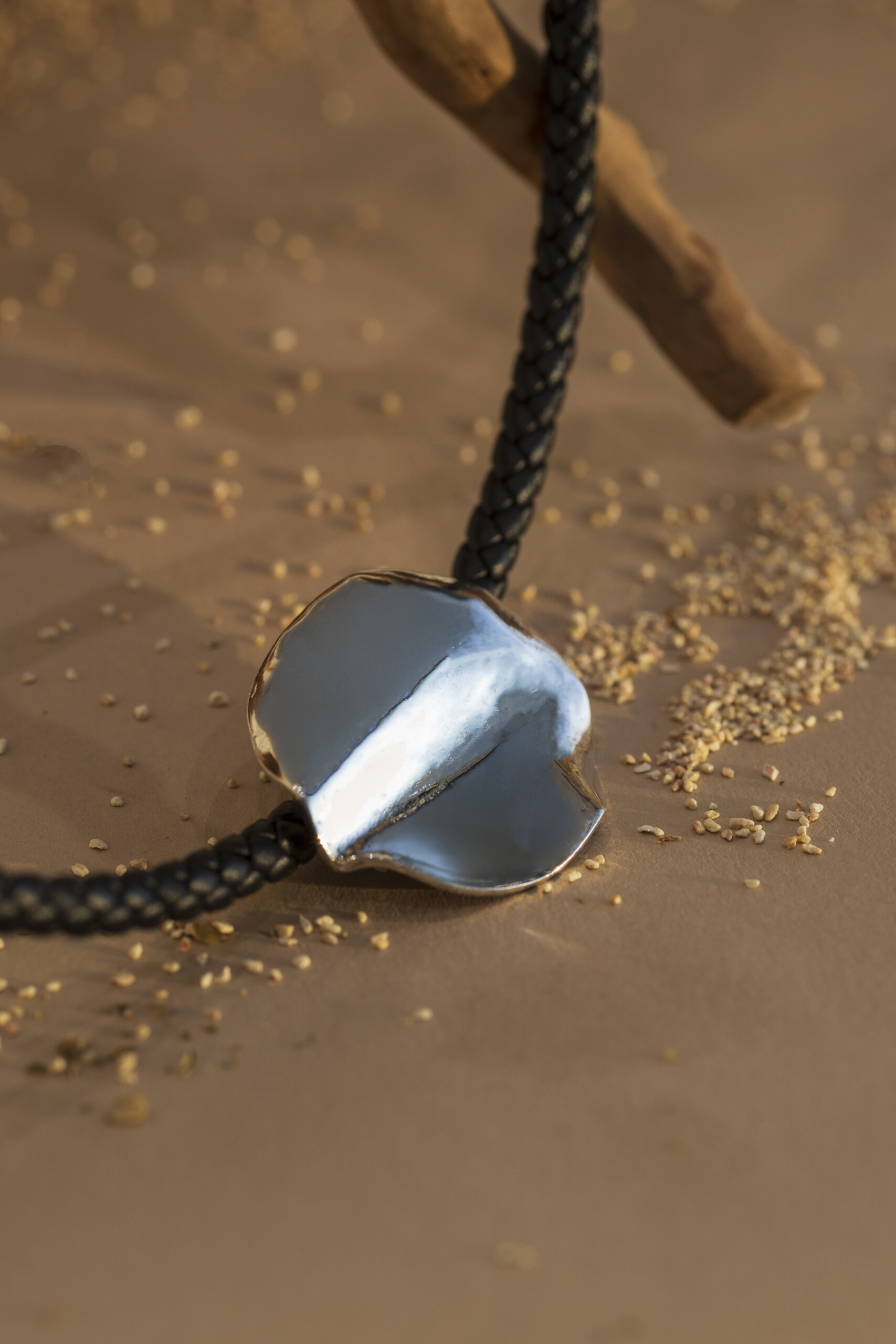 Interamente fatto a mano, questo girocollo in argento e pelle è l’accessorio ideale per chi ama i gioielli di carattere che non passano inosservati. Perfetto da indossare da solo come pezzo unico o in abbinamento agli altri gioielli della collezione Moon per un look coordinato e originale.