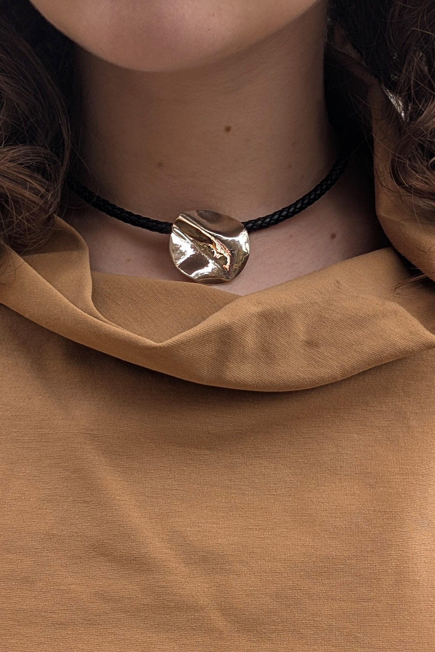 Questa versione del girocollo Moon è la più audace e giocosa della collezione. Il design è caratterizzato da un girocollo rigido in pelle nera a 5 fili, che dona una struttura moderna e decisa al gioiello. Il pezzo forte è la luna dall’effetto mosso, qui proposta in una versione più vistosa e lucida per riflettere la luce ad ogni movimento.