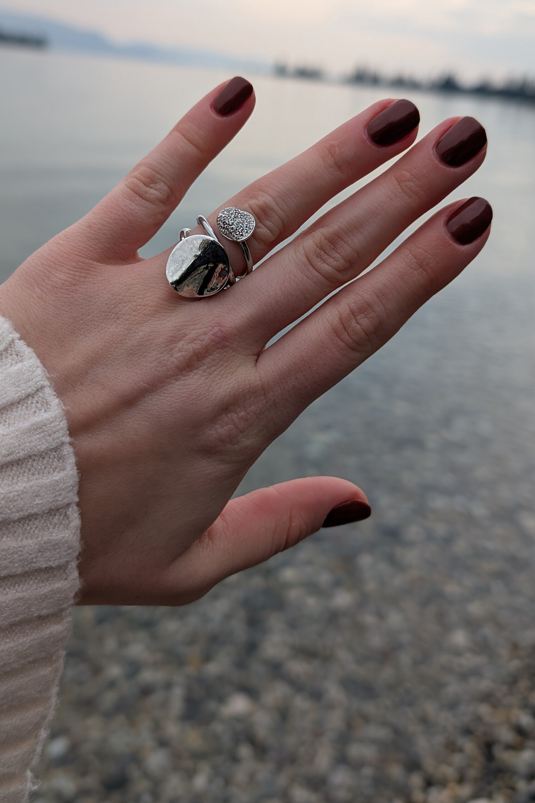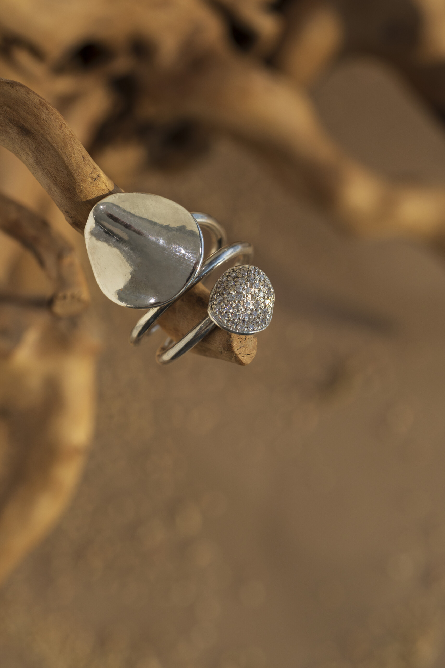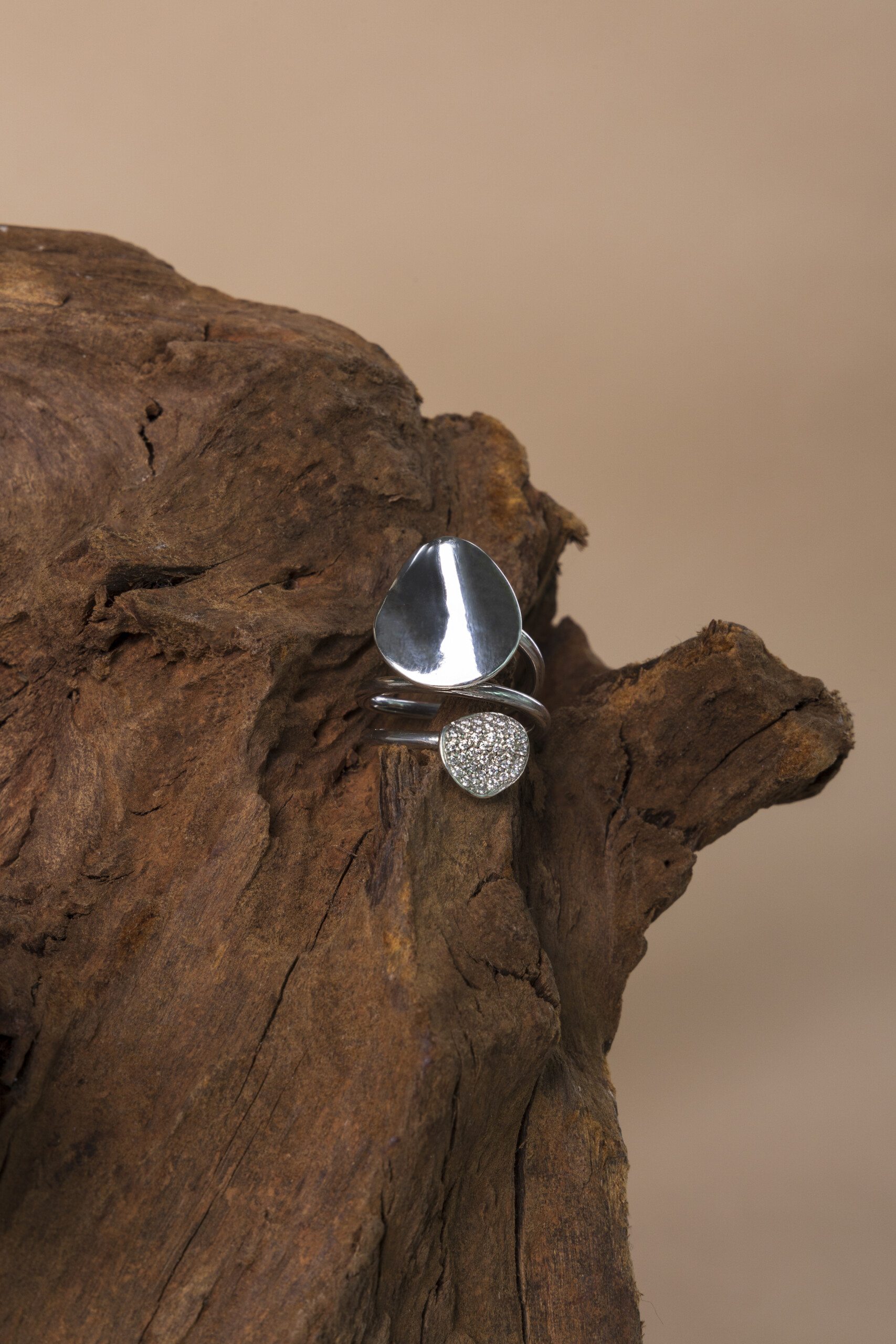 Questo anello a fascia è realizzato a mano con un filo in argento 925 a tre giri, sormontato da due lune di diversa grandezza e finitura. Il design gioca sul contrasto materico tra la luna in argento lucido e quella impreziosita da un elegante pavé di zirconi brillanti.
