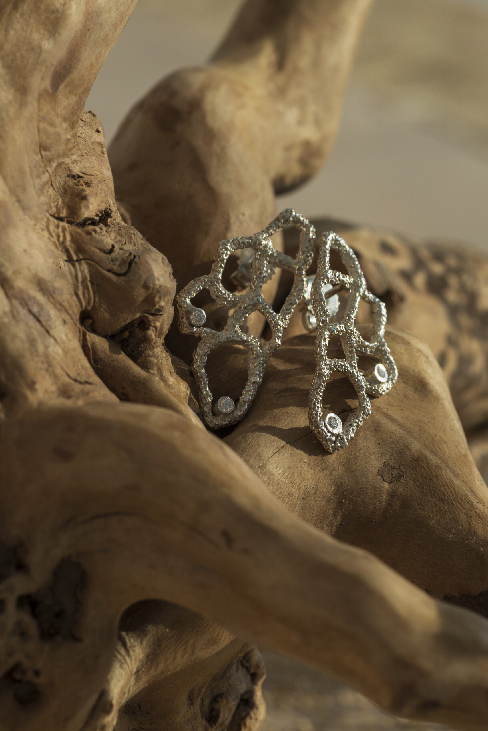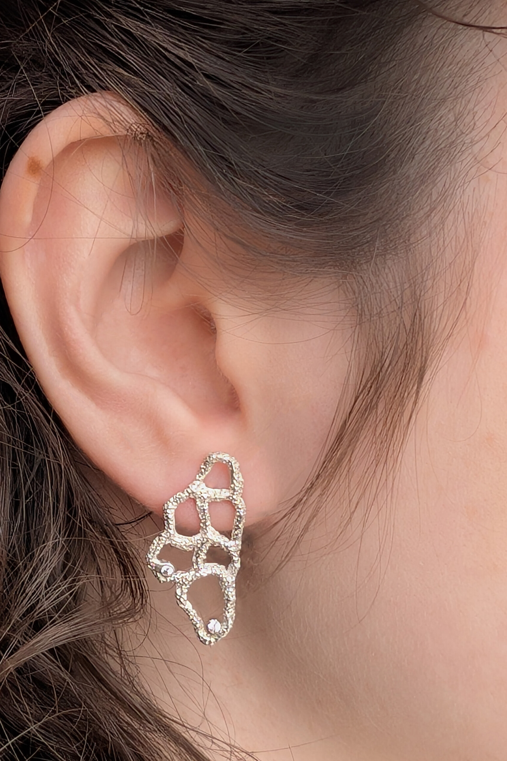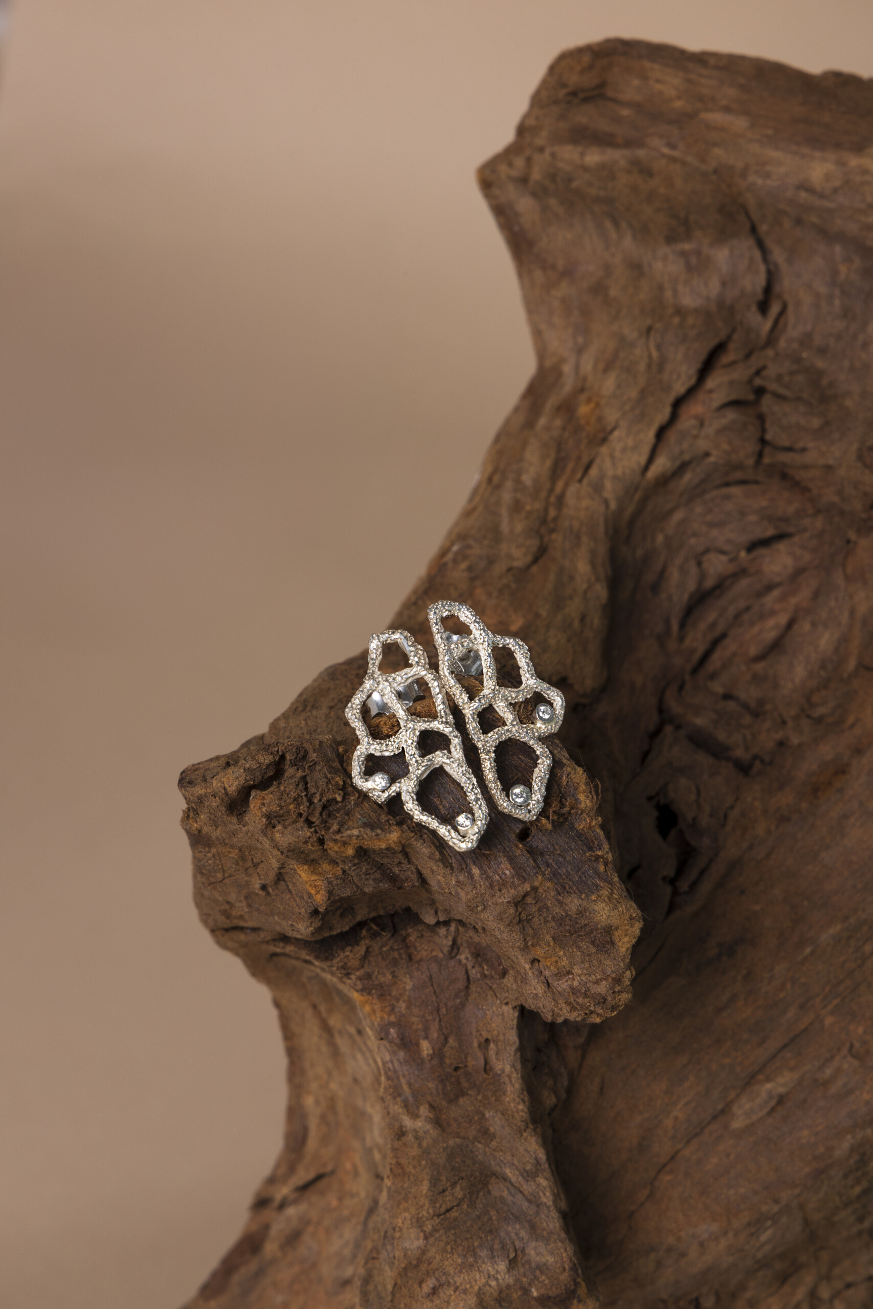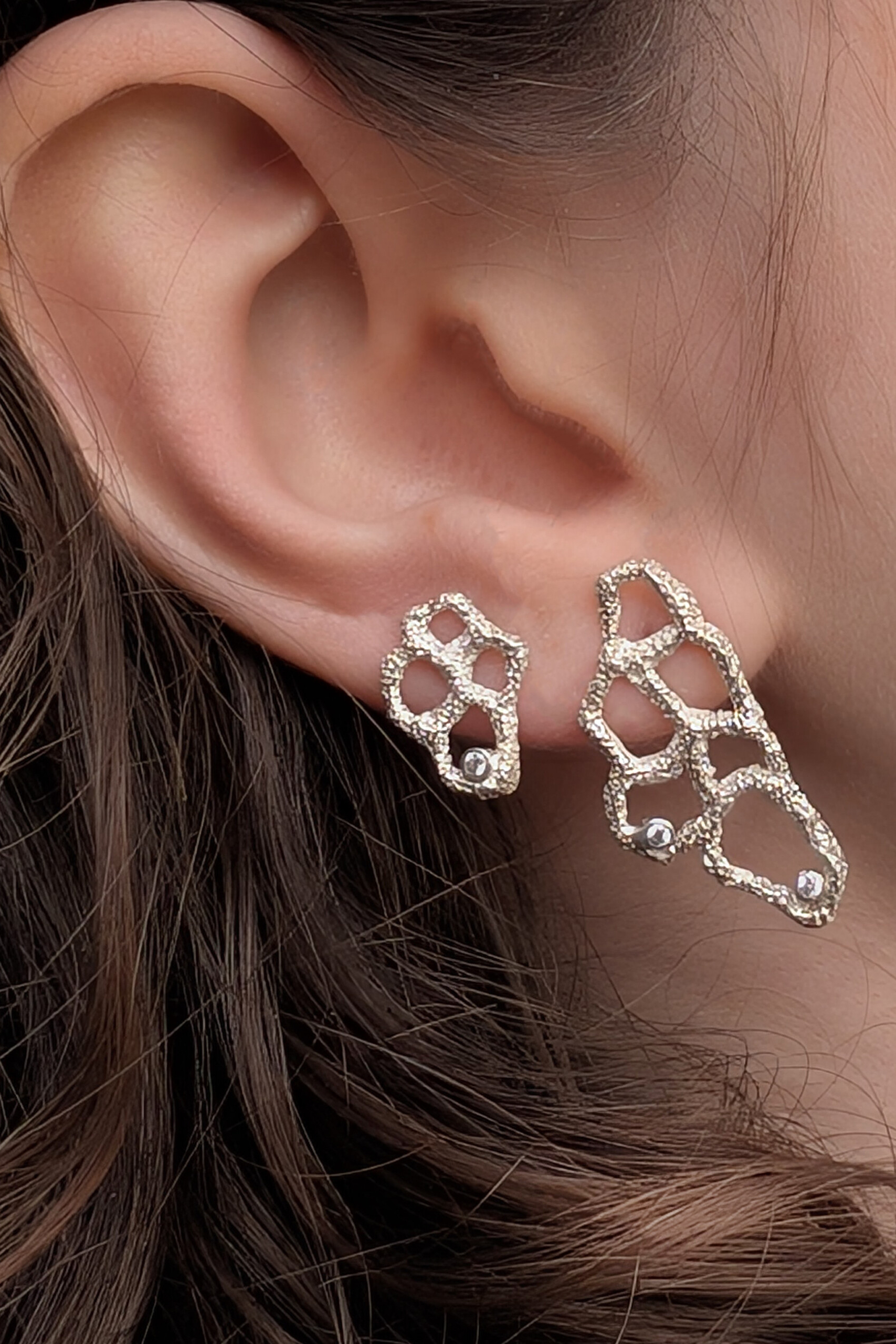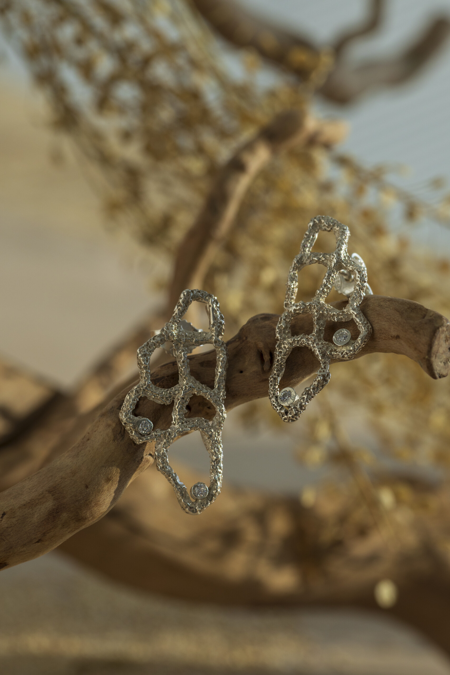 Questi orecchini in argento 925 sono caratterizzati da una texture ricercata con effetto lucido/satinato, realizzata interamente a mano. Il design è impreziosito dall’incastonatura di 4 piccoli zirconi brillanti, scelti per donare un punto luce deciso alla superficie materica del metallo.