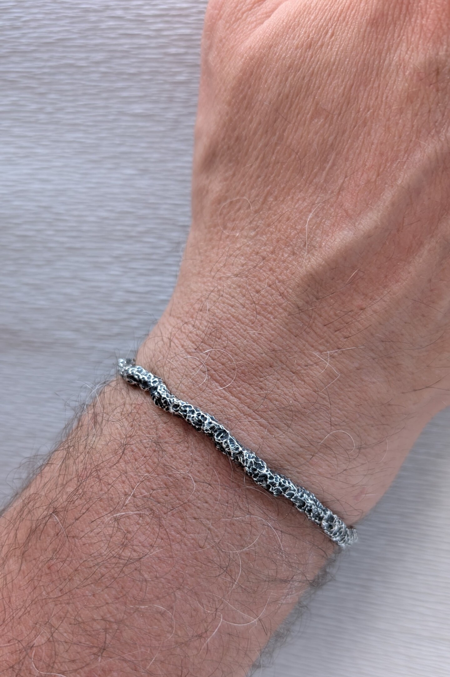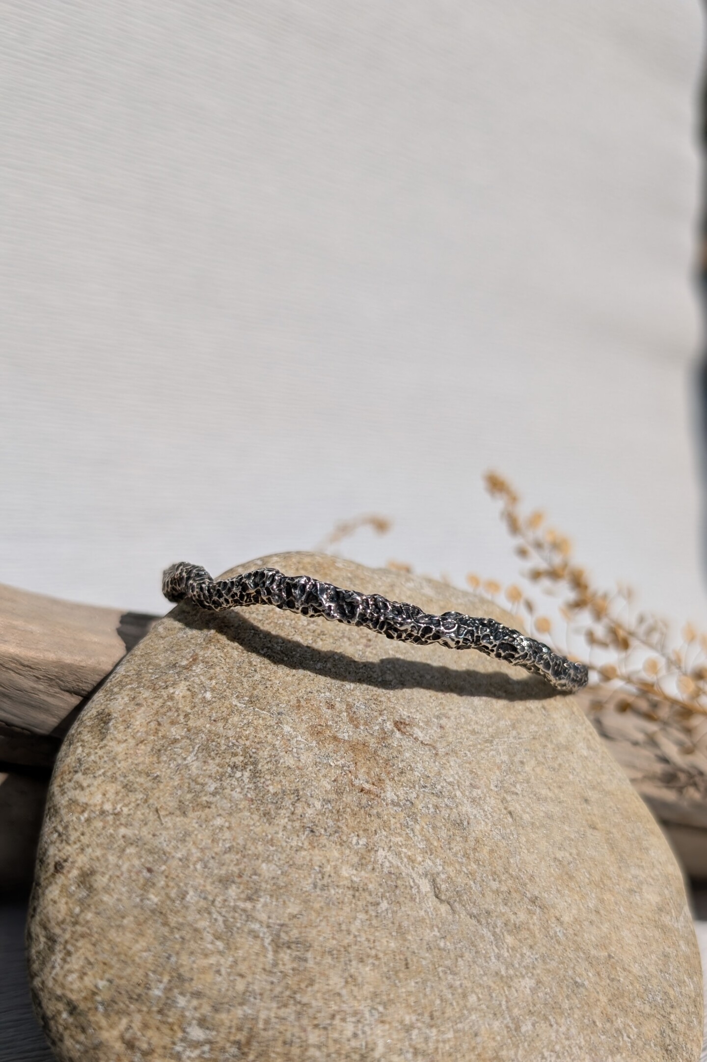 Questo bracciale alla schiava è realizzato interamente in argento 925 brunito, un gioiello artigianale che unisce forza e raffinatezza. La sua superficie presenta una texture materica lavorata con piccoli solchi che creano un profondo effetto di chiaroscuro: le parti concave e scure contrastano con una fitta rete di rilievi lucidi.