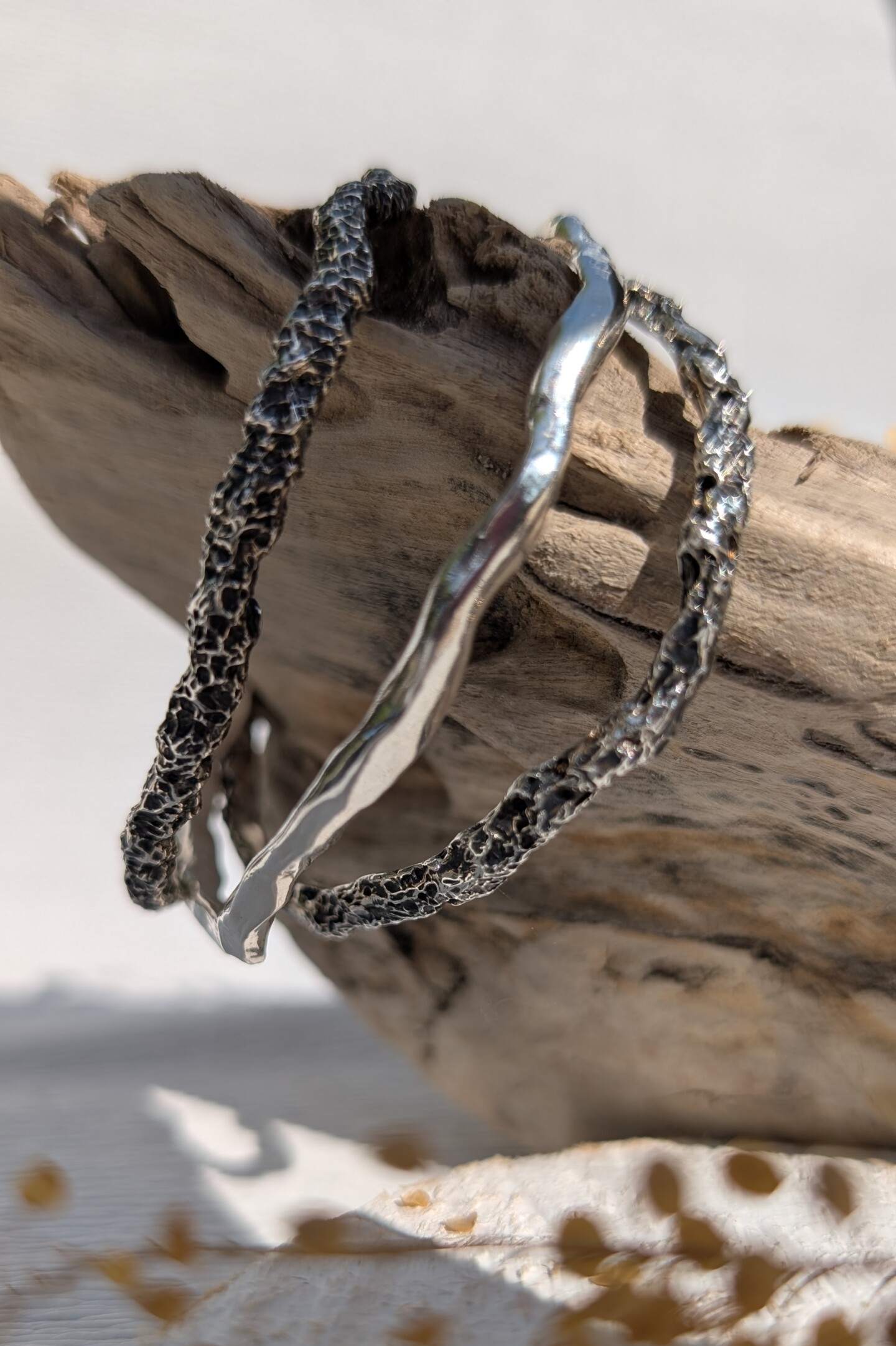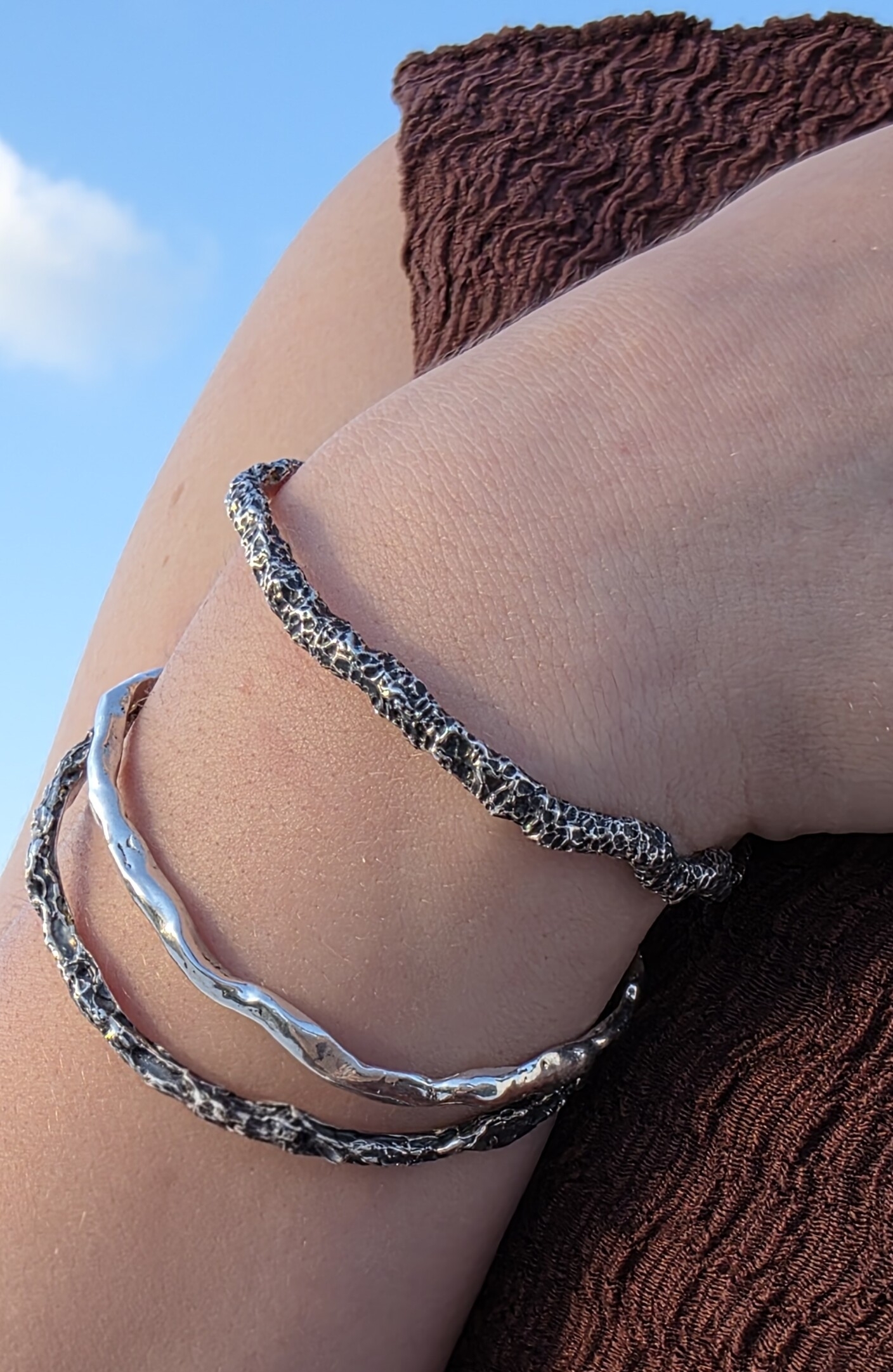 Il risultato è un bracciale rigido dall’aspetto dinamico e omogeneo, dove il gioco di luci e ombre esalta l’unicità della lavorazione fatta a mano. Perfetto per chi cerca un accessorio dal design contemporaneo ispirato alla pietra vulcanica da cui prende il nome.