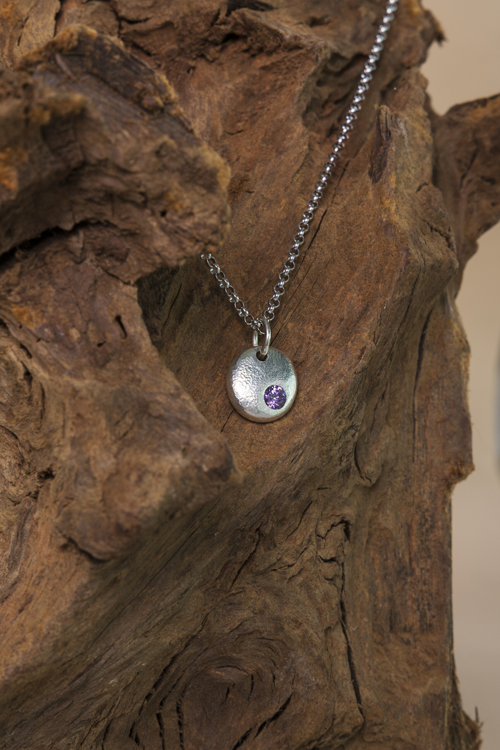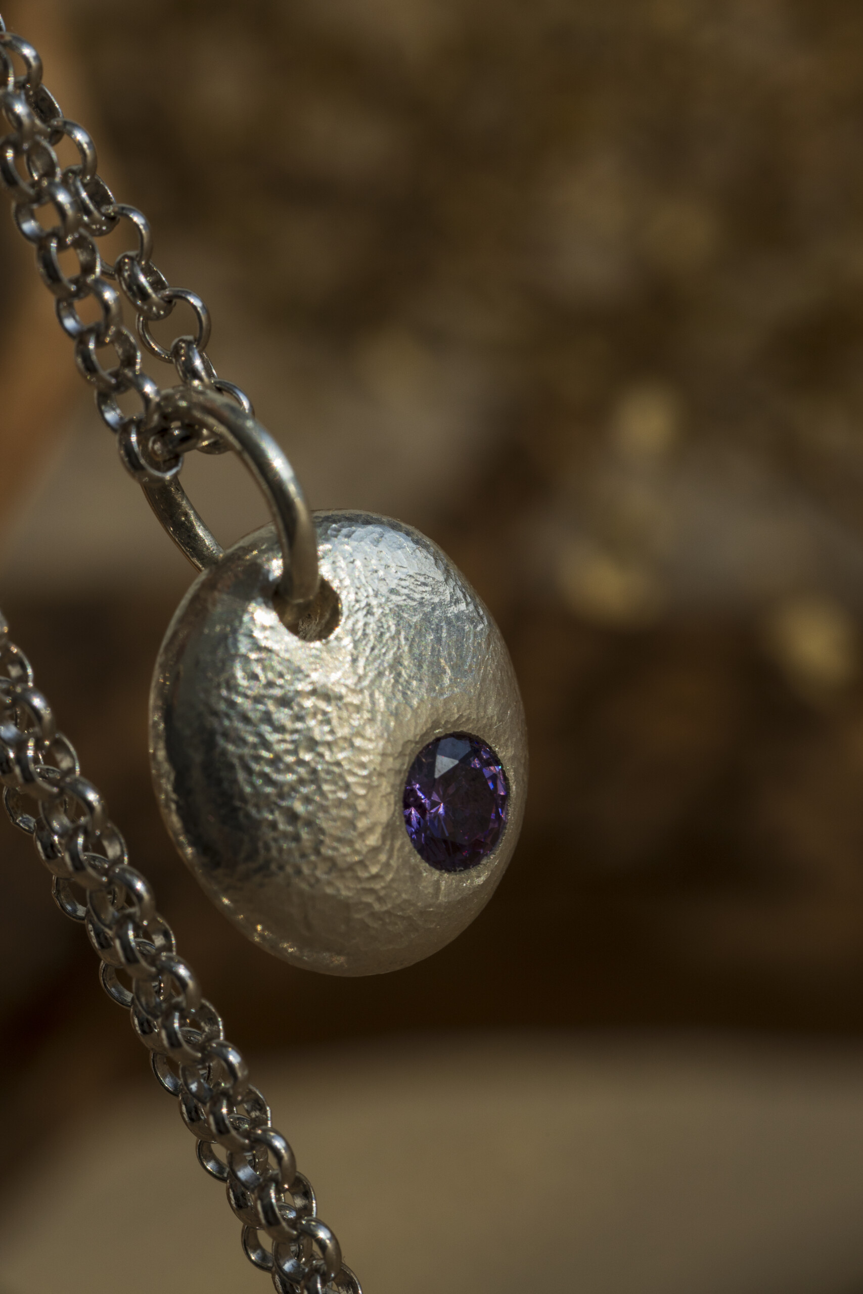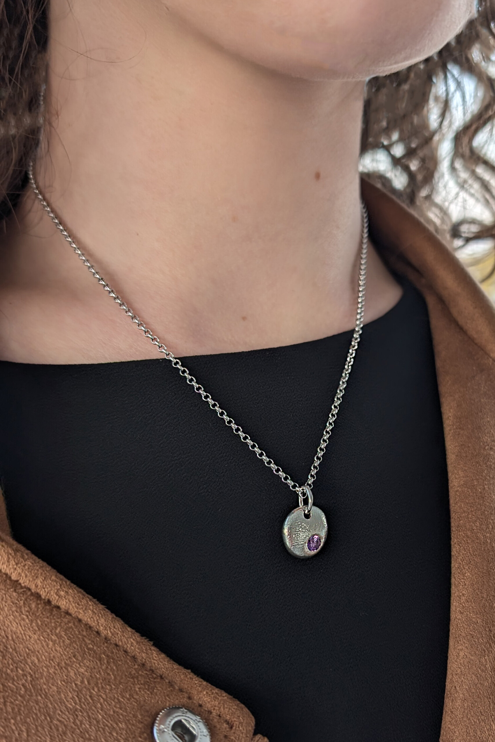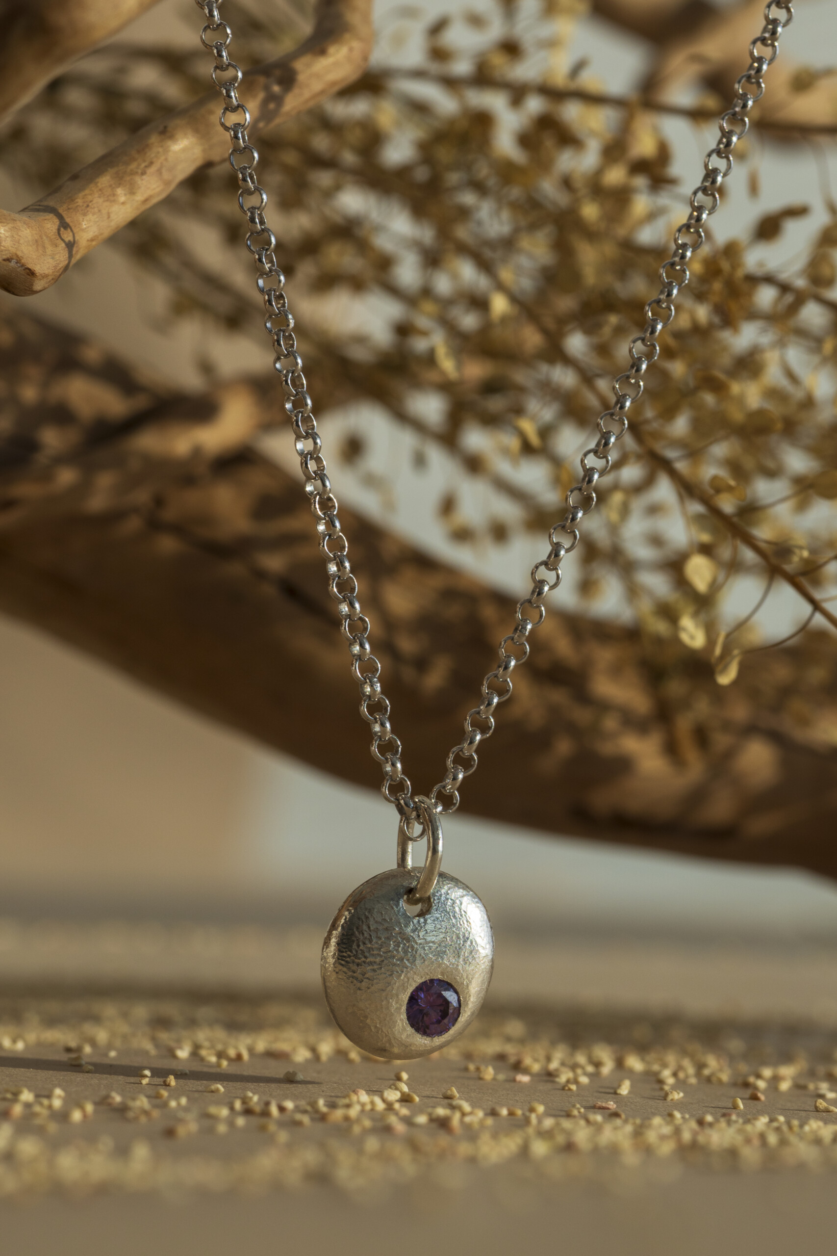 Questa collana in argento 925 monta una raffinata maglia rolò che sostiene il ciondolo Pepita, qui proposto in una versione dal carattere materico. Il ciondolo è stato lavorato con un effetto martellato realizzato a mano, che ne esalta l’artigianalità, e racchiude al suo interno un’ametista incastonata.